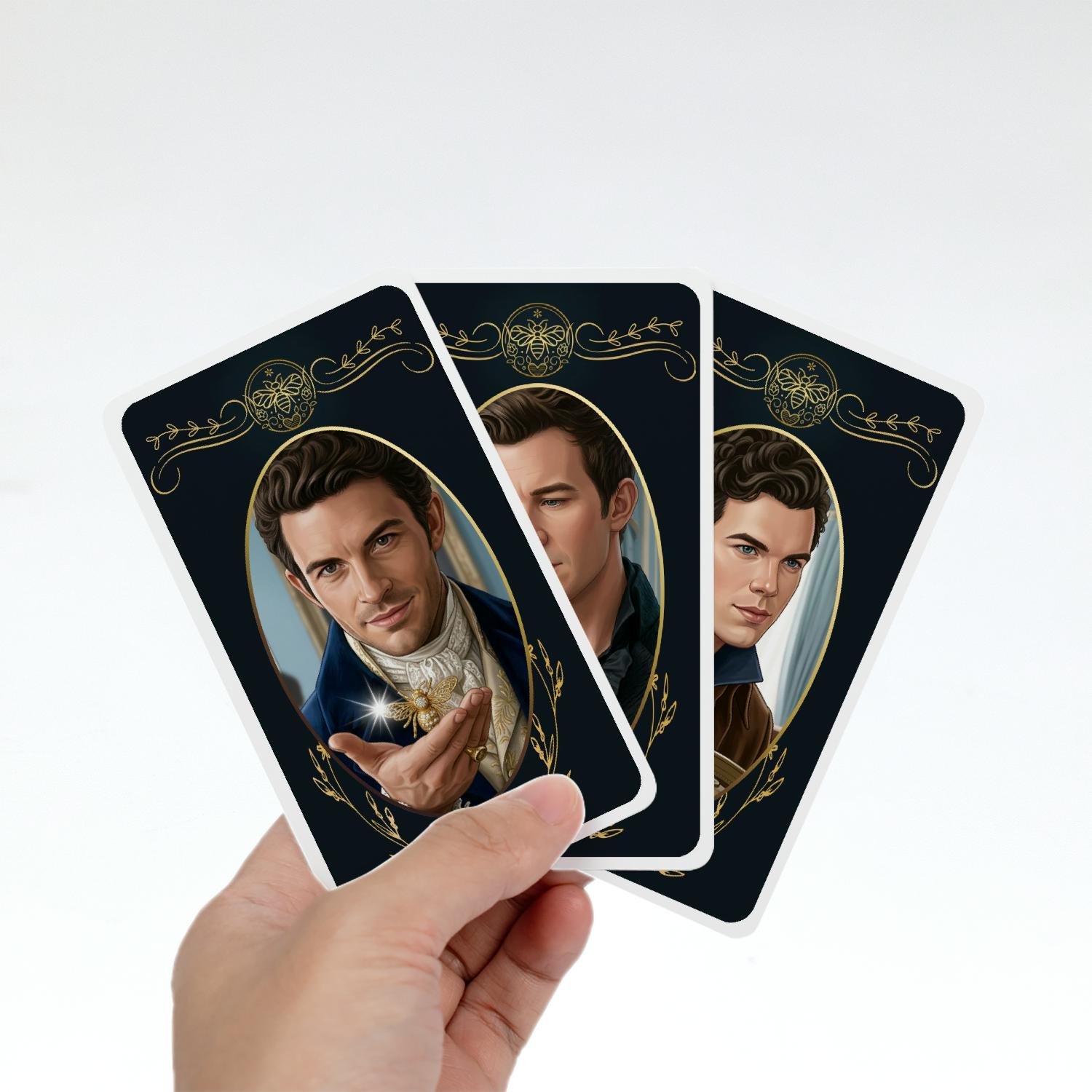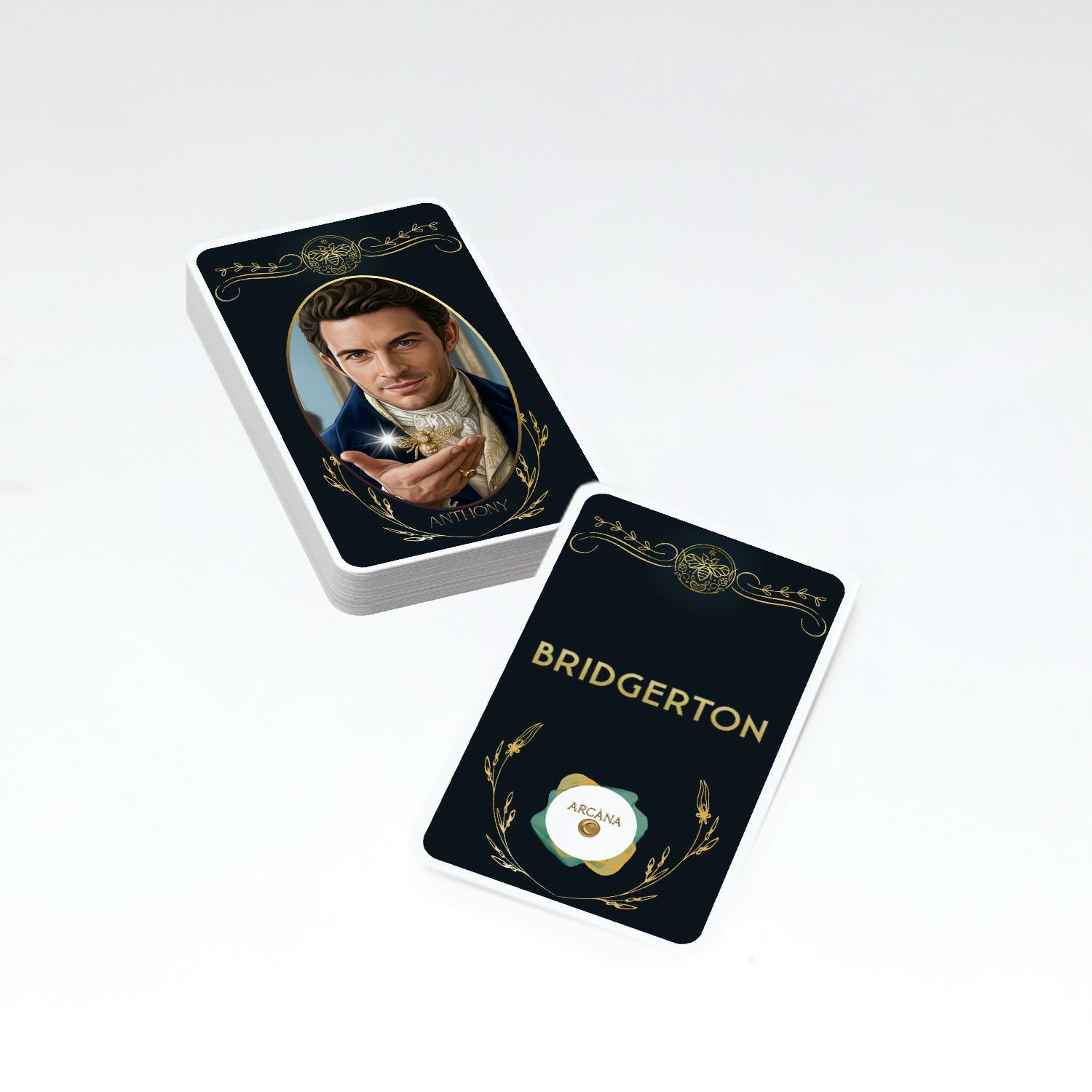 A Bridgerton Custom Tarot Deck with 20 characters cards! Each card measures 2.75″ × 4.75″ (approximately 70 mm × 121 mm) — the standard size for tarot decks.